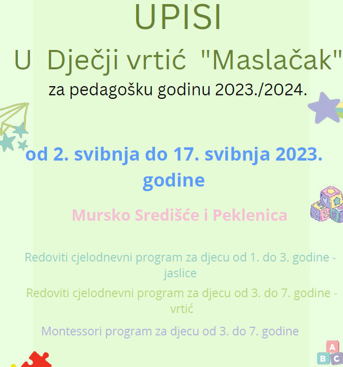 [ODLUKA] o upisima u Dječji vrtić Maslačak za pedagošku godinu 2023./2024.