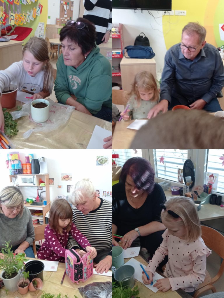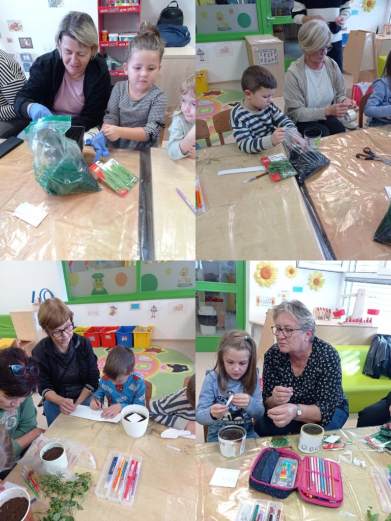 Listopad smo započeli puštanjem balona i pjevanjem dječjih pjesmica na trgu u Murskom Središću i na taj simboličan način otvorili Dječji tjedan. Likovnim i govornim aktivnostima podržali smo temu ovogodišnjem Dječjeg tjedna – empatija. Bake i djedovi stigli su nam na druženje i radionicu, gdje su zajedno sa svojim unucima posijali začinsko bilje u teglice koje su ukrasili kreativnim crtežima i ponosno ispisali svoja, ali i imena svojih baka i djedova. Provodili smo sklop aktivnosti povodom Dana kruha i zahvalnosti za plodove zemlje.
