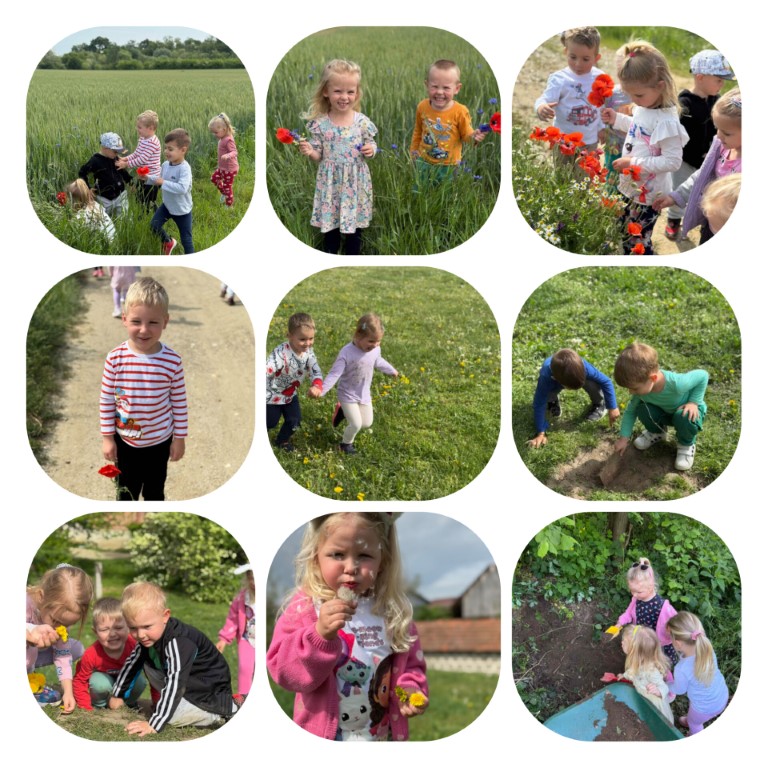 Proljetne dane iskoristili smo za boravak u prirodi. Istraživali smo livade pune mirisnog cvijeća, makova i raznih biljnih vrsta. Promatrali smo pčelice, leptire i kukce te učili o njihovoj važnosti za prirodu. Djeca su skupljala latice, lišće i kamenčiće, od kojih smo kasnije stvarali zanimljive likovne radove.